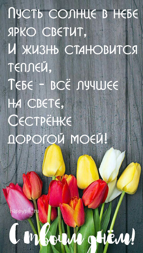 200 красивых открыток с поздравлениями сестры в день рождения Кроме подарка и цветов, в день рождения любимой сестры хочется пожелать ей всего самого лучшего. Мы подобрали лучшие картинки с теплыми пожеланиями для родного человека. С днем рождения сестренка! Любимой сестренке Прикольные картинки От брата Post Views: 176