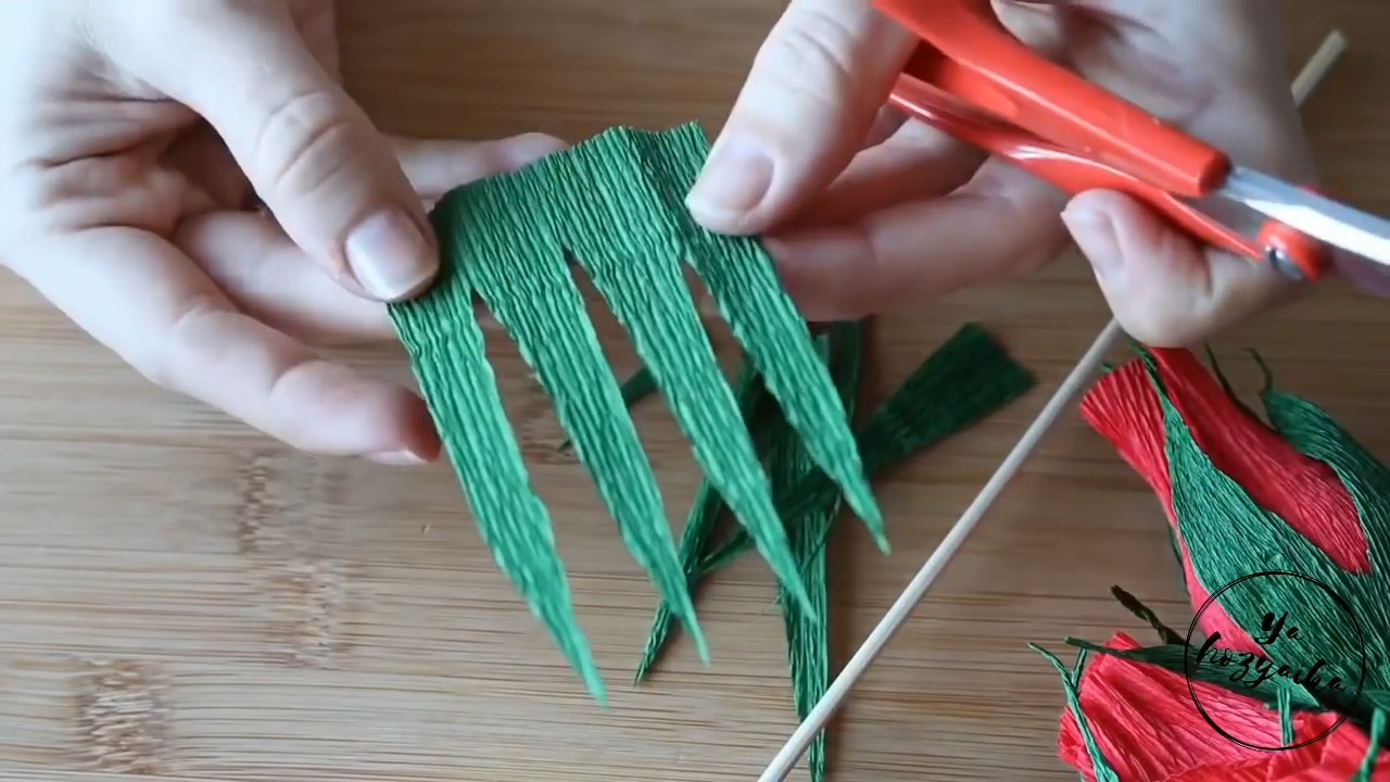 Место стыка бутона и шпажки закрываем полоской бумаги зеленого цвета, обмотав ее вокруг основания цветка и деревянной шпажки. Конец полоски фиксируем на клей.