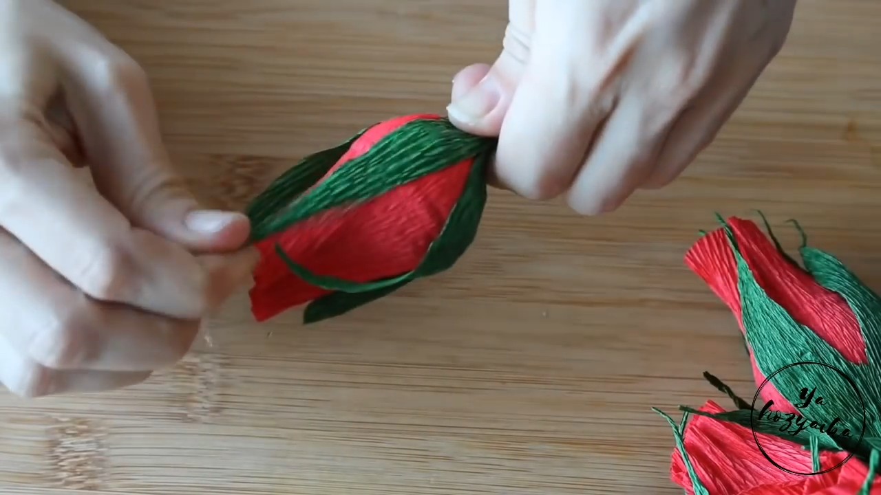 Для начала соберем бутоны цветов. Из гофрированной бумаги красного цвета вырезаем прямоугольник со сторонами 10х11 см. Из зеленой бумаги подготовим прямоугольник 6х10 см.