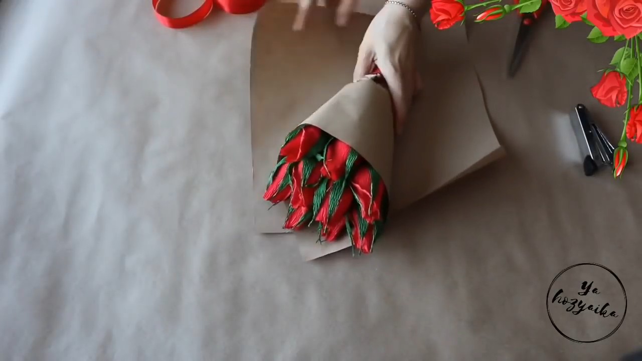 Из оберточной бумаги подготовим квадрат 30х30 см. Располагаем бумагу уголком вверх, оборачиваем в нее букет и завязываем на узел лентой.