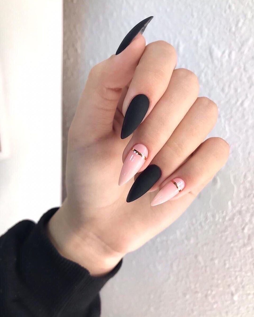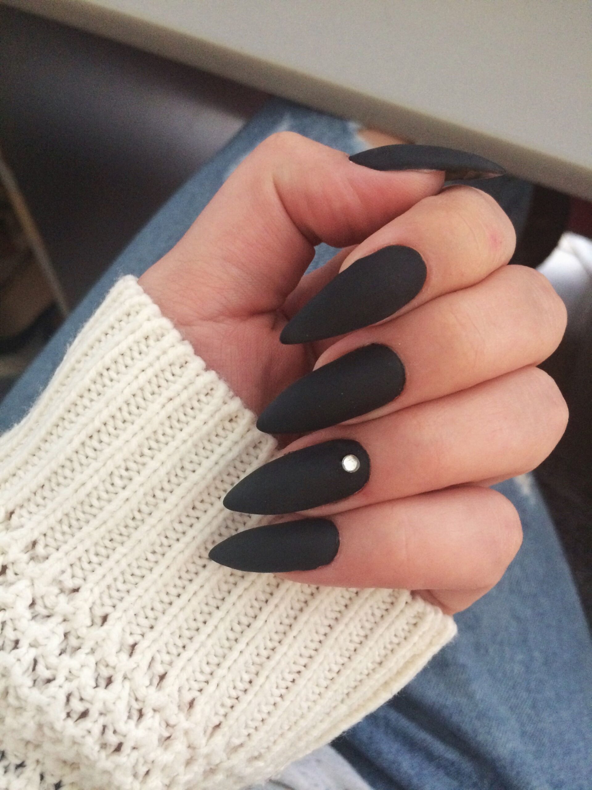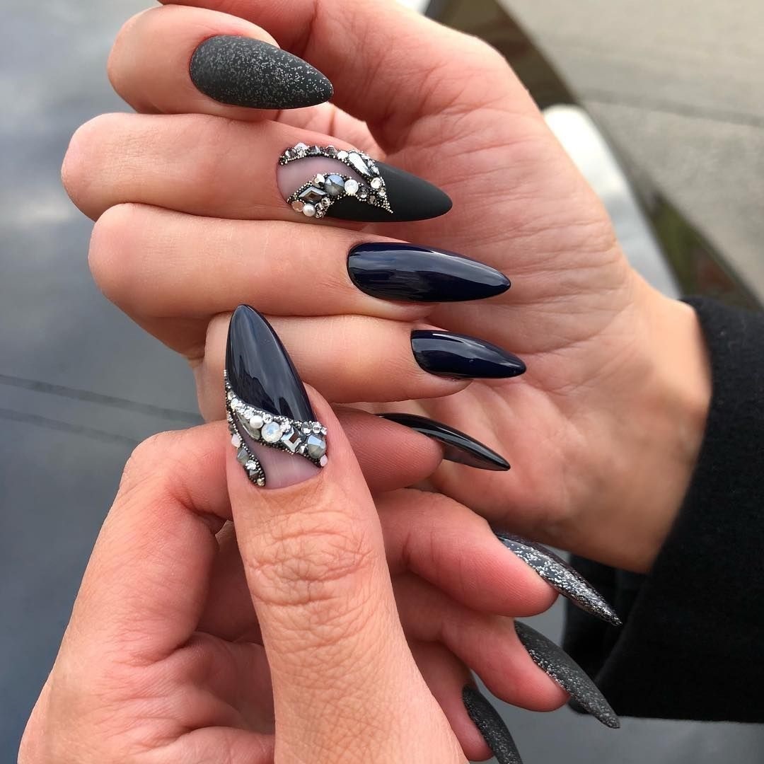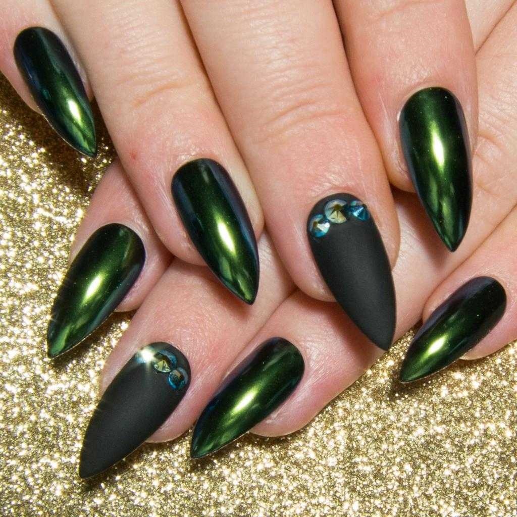 Тем, у кого острые ногти, мы не советуем быть скромнее. Ведь смирение не носит такой смелой формы. Как бы общество ни относилось к этой форме, никто не станет отрицать, что черный цвет и острые ногти просто созданы друг для друга. Черные ногти — отличное поле для экспериментов. Пылающие картины, художественная роспись, камни — все это в острой форме в черном цвете просто завораживает.