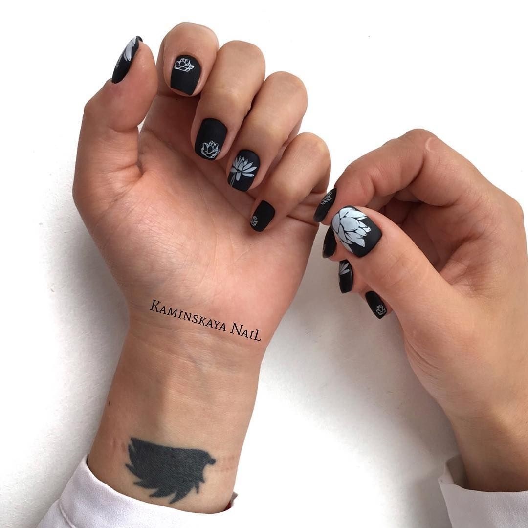Оригинально и адекватно будет смотреться матовое черное покрытие на ногтях. При этом выглядит невероятно эффектно и стильно в любое время года. Бархатистая основа и черный цвет позволяют украсить ногти дополнительными элементами декора и узорами.