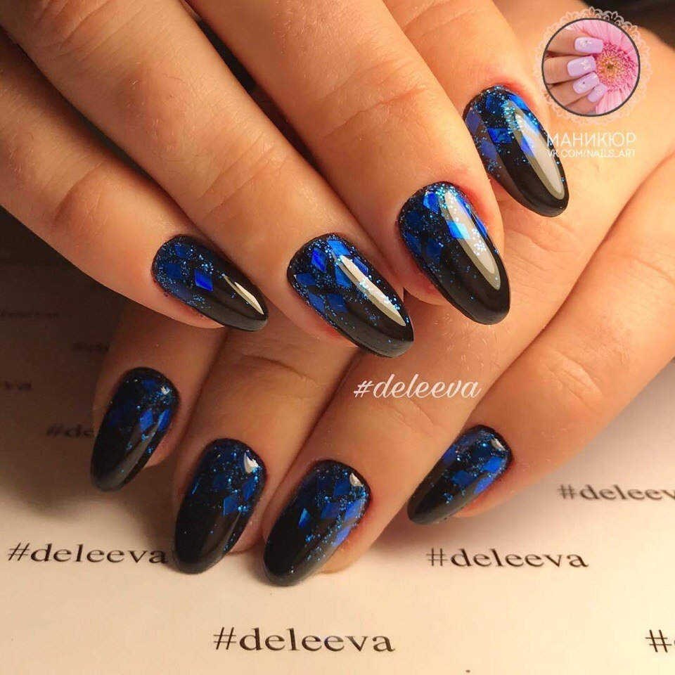 Если речь идет о блестящем маникюре, стилисты рекомендуют использовать пайетки, глиттер и стразы. Они являются стильным дополнением к модному черному маникюру, дизайн с ними выглядит празднично и актуально, особенно зимой. Ведь в моде нейл-арт в виде цветных страз, бус, голографических наклеек и других сверкающих орнаментов.