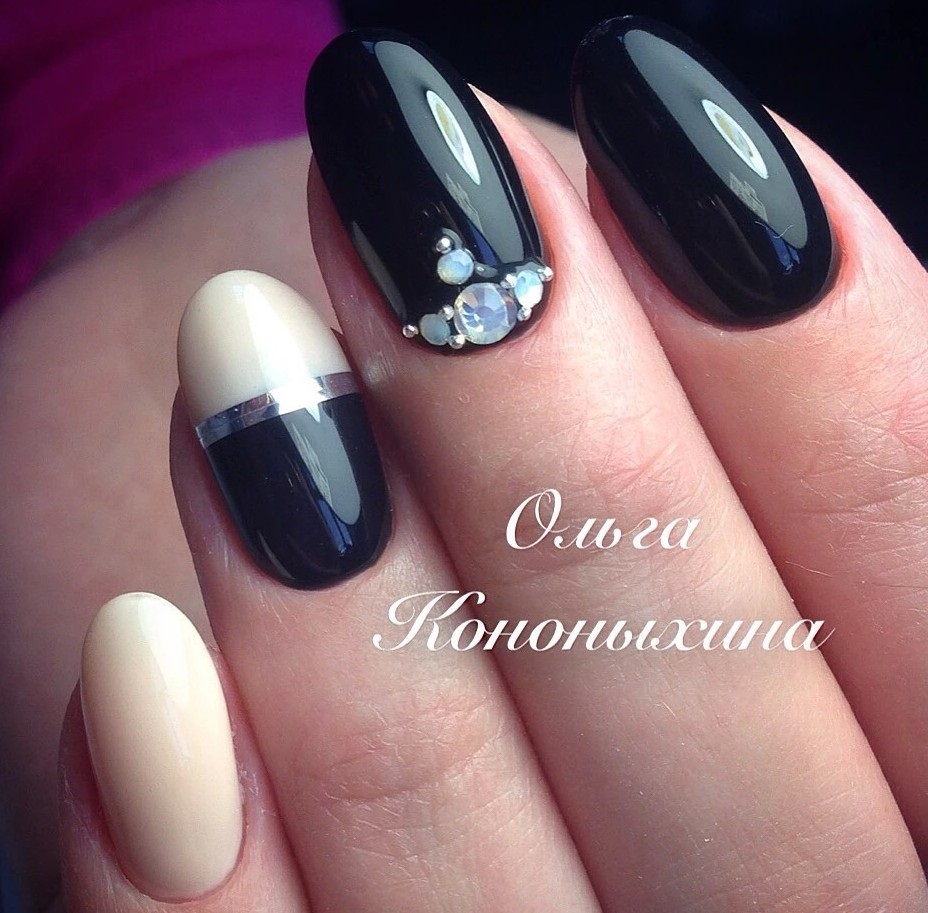 Чтобы исправить некоторые недостатки ногтей или просто создать красивый акцент, можно добавить в маникюр аккуратный черный фон, украсив его всего одним пальцем. Например, в качестве украшений можно использовать пайетки, стразы, фольгу или камифубуки. Другая возможность — оформить ноготь в градиентной технике.