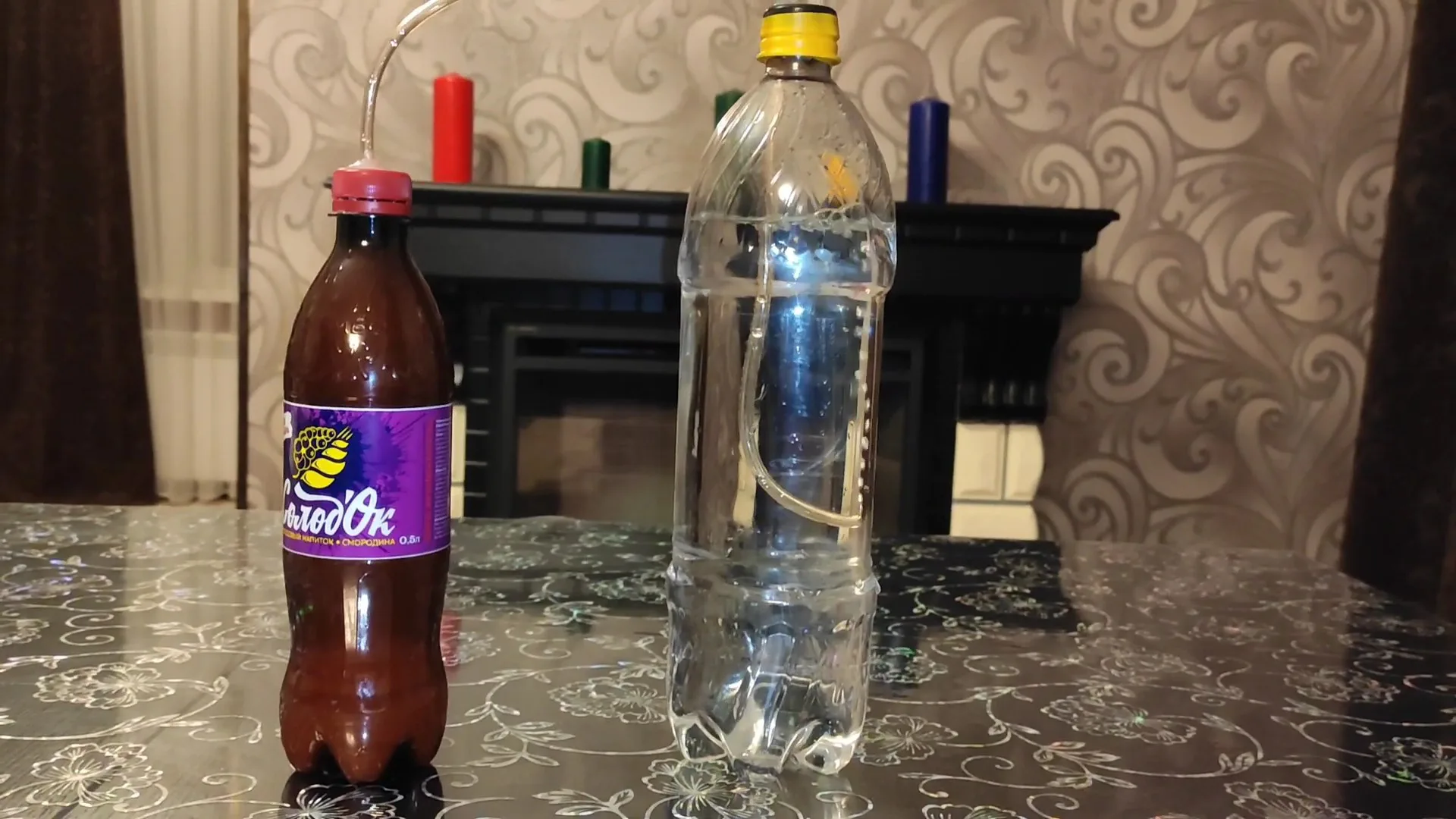 Через трубочку газ из одной бутылки попадет в другую, газируя воду в ней.