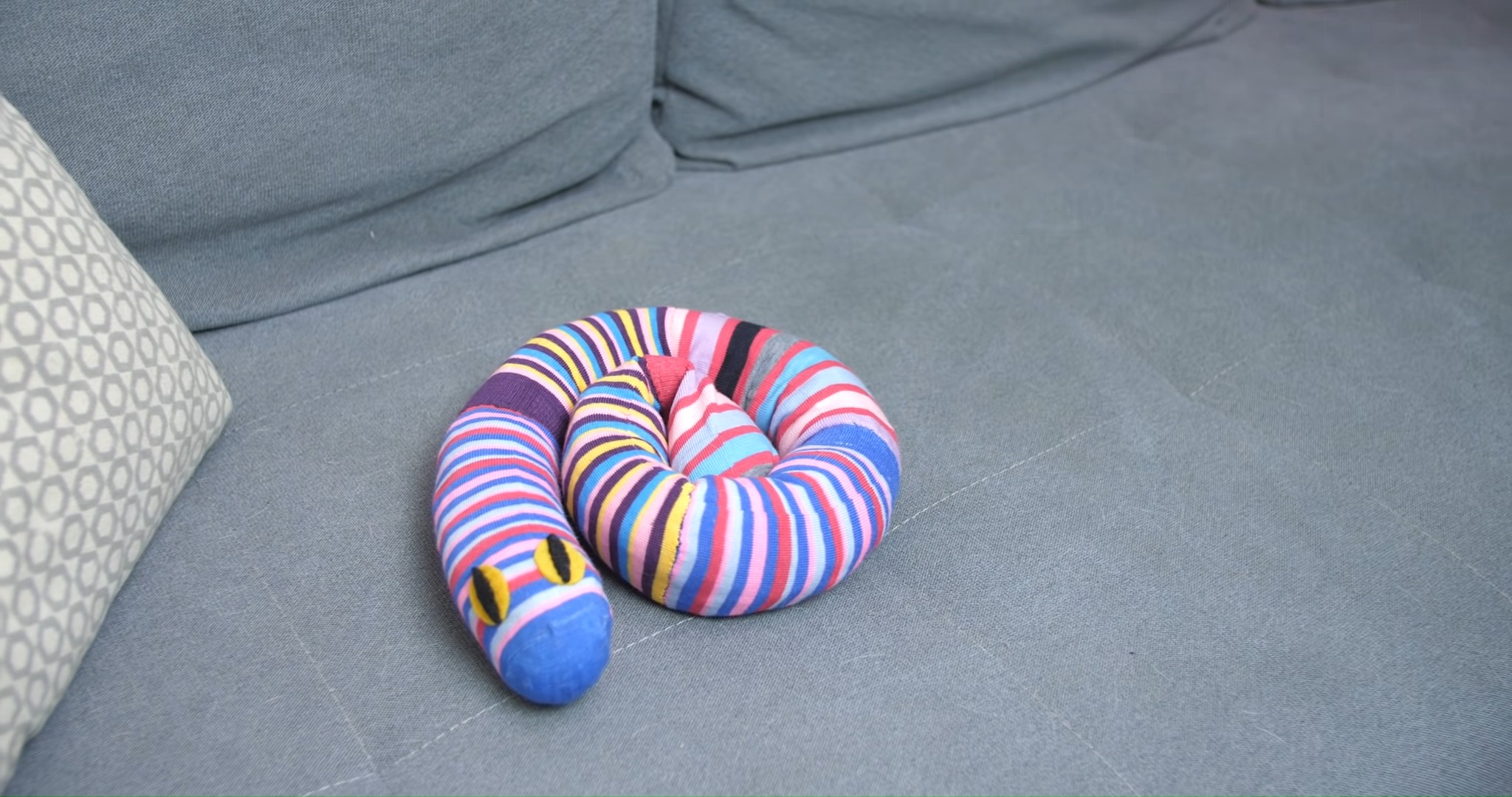 Из всех половинок носков сшиваем тело змеи. 2 детали, у которых не отрезана область возле пальчиков, располагаем по краям змейки. Это будет голова и хвостик. На этом этапе хвостик или голову пока не пришиваем, так как игрушку еще нужно наполнить.