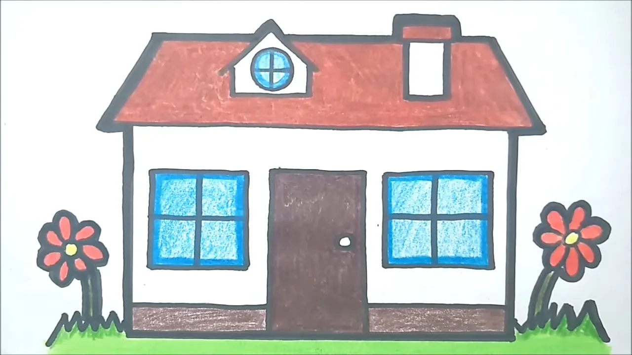 Нарисуем траву у дома и пару цветов. Но можно изобразить и деревья с кустами. Пусть поработает фантазия.