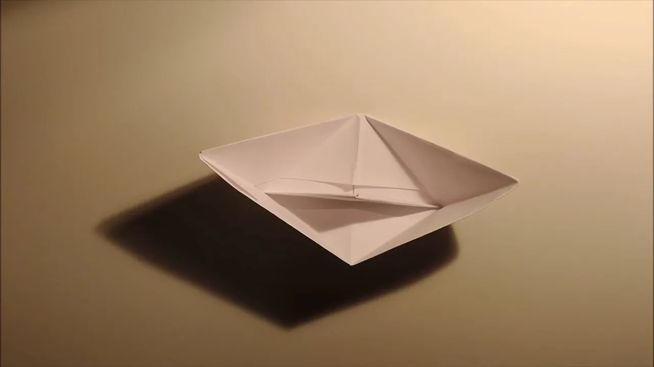 Берем заготовку для кораблика пальцами посредине за бока и тянем в стороны. Заготовка сложится в ромбик.