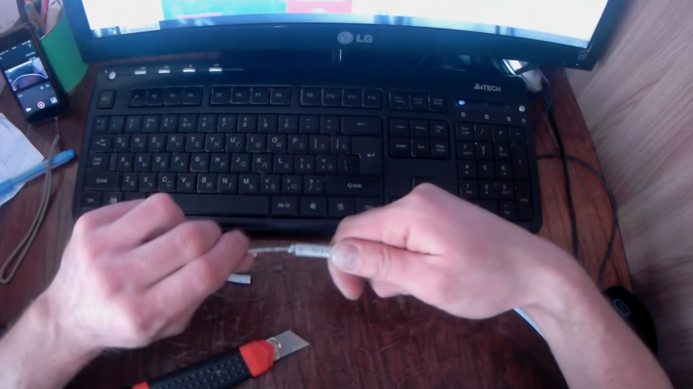 С одного конца телевизионного кабеля нужно срезать 5 сантиметров верхней изоляции. Делать это надо аккуратно, чтобы не повредить экранированную оплетку, которая находится под ним.