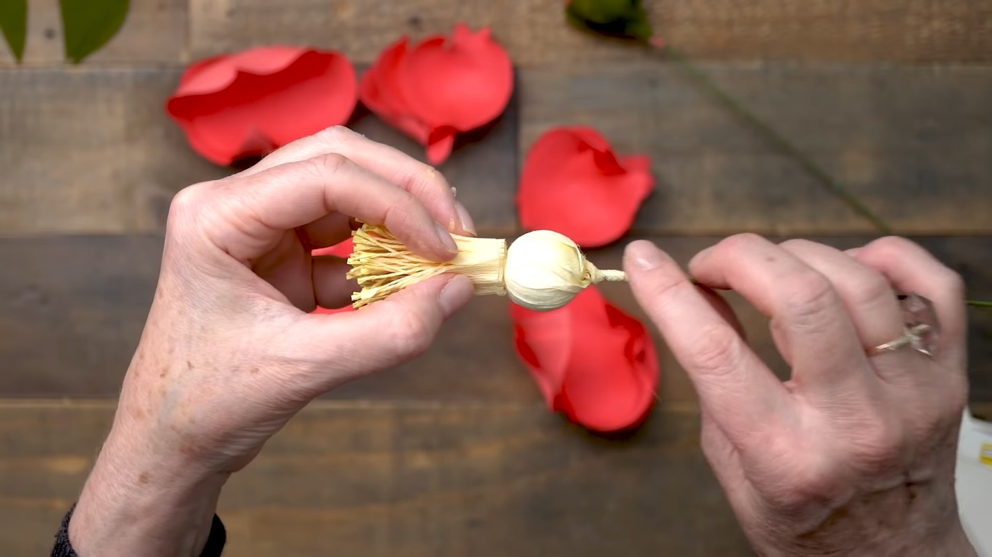 Заготовки для тычинок складываются вместе и скручиваются. Их приклеиваем сверху основания для бутона.