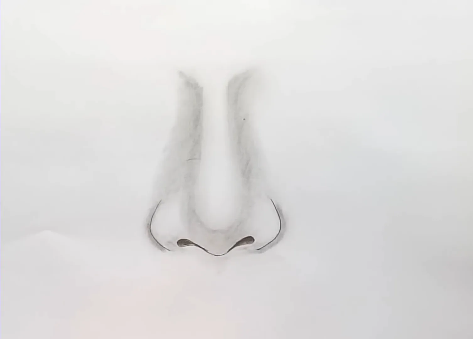 Нарисуем кривую линию с двумя петельками по краям – это кончик и ноздри носа. Ноздри полностью затемним карандашом.