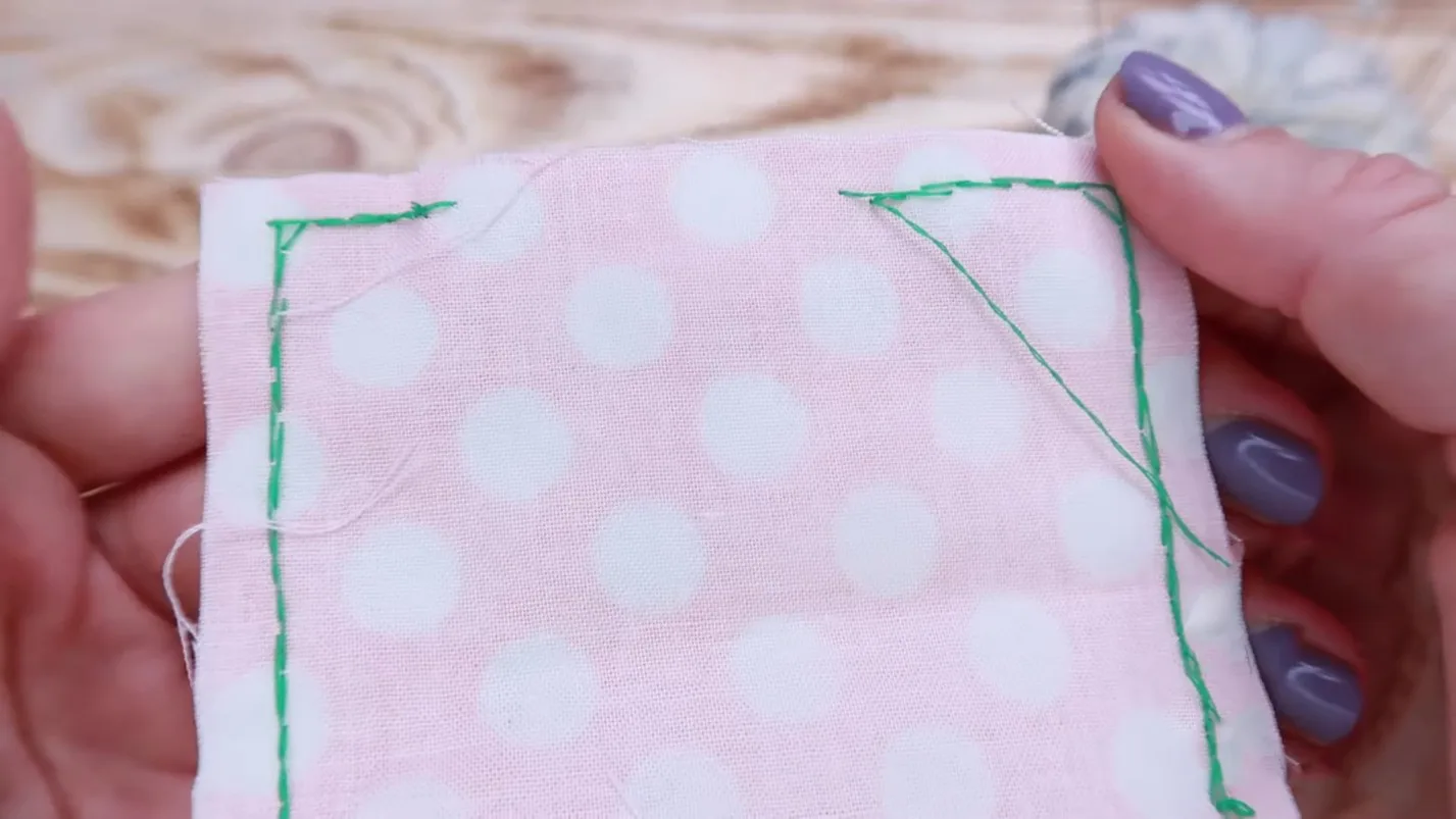 Продеваем нитку в иголку, завязываем конец. Отступаем на полсантиметра от края тряпицы и снизу вонзаем иглу. Вытягиваем полностью.