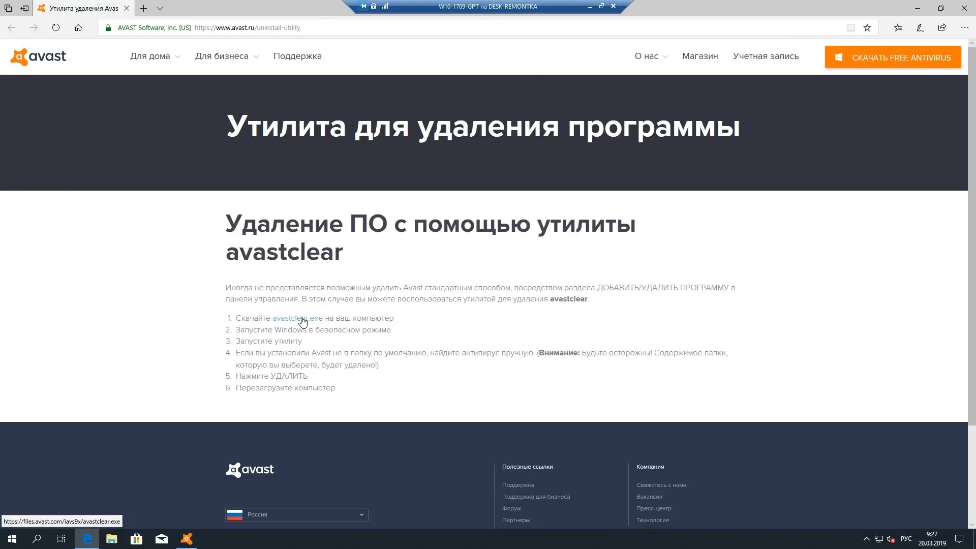 С официального сайта Avast скачайте специально разработанную для деинсталляции утилиту Avastclear. Она полностью бесплатна и позволяет безопасно удалить разные версии антивируса.